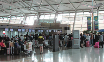 평일 아침 8시의 체크인을 기다리는 승객들로 붐비는 인천공항 카운터.