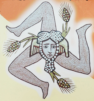 시칠리아를 여행하다 보면 흔하게 만나는 모양의 상징이 있다. ‘세발 달린 메두사’인 트리나크리아(Trinacria? 사진)이다. 트리나크리아는 시칠리아의 옛 지명이자, 삼각형 모양의 땅이란 뜻. 세 개의 발은 시칠리아 서쪽 마르살라(Marsala) 의 릴리베오(Lilibeo)곶, 남쪽 빠치노(Pachino)의 파쎄로(Passero)곶, 동쪽 메시나(Messina)의 페로로(Peloro)곶을 가리킨다. 각각의 발은 유럽, 아프리카, 중동지역을 향한다. 메두사의 머리는 뱀 대신, 밀 모양의 곡식으로 치장했는데, 시칠리아가 고대 로마시대부터 밀 생산지로 유명했기 때문이다.