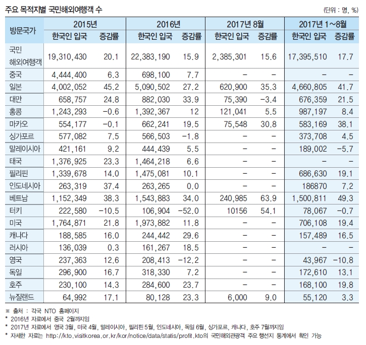 지난 8월 관광수입은 13.6억 달러로 지난해 8월 대비 10.5% 감소했다. 외래객 1인당 지출금액은 1233달러로 지난해 8월보다 34.9% 증가했다. 같은 기간 관광 지출은 23.3억 달러로 지난해 8월 대비 1.0% 증가했으며 국민해외여행객 1인당 지출금액은 975달러로 지난해 8월보다 12.6% 감소한 것으로 분석됐다. 한편 국민해외여행객이 가장 많이 찾는 지역은 일본으로 지난 1월부터 8월까지 일본을 찾은 한국인 여행객 수는 466만805명으로 집계됐다. 이는 지난해 같은 기간 대비 41.7%가 증가한 수치다.