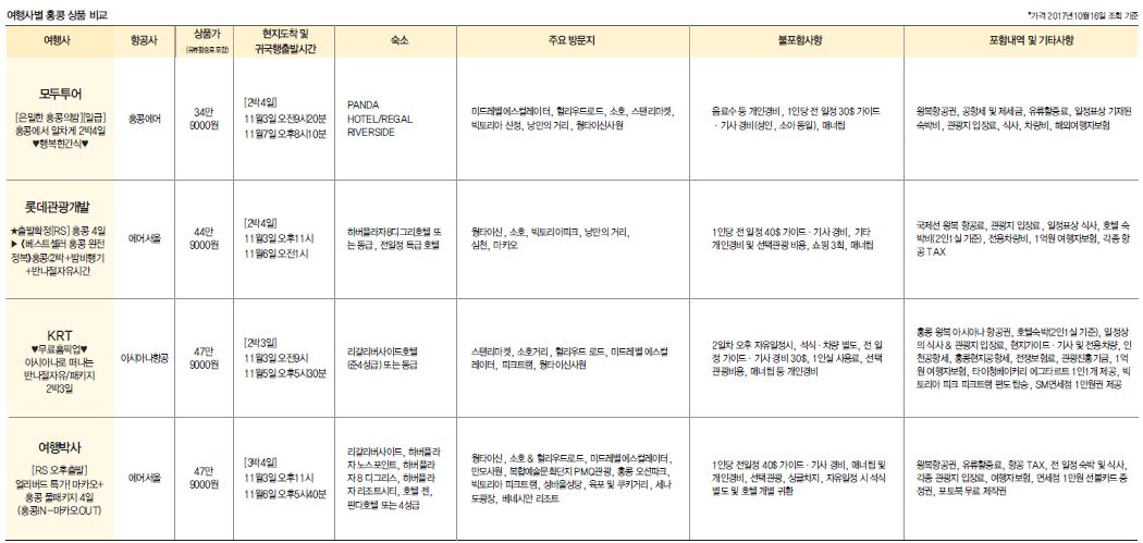 올해는 긴 연휴가 많았던 덕에 아웃바운드 수가 급증했지만 앞으로 남은 기간 동안에는 연휴 특수가 없어 장거리 출국객이 그다지 많지 않을 것으로 분석된다. 하지만 단거리 여행에 대한 수요는 계속해서 지속 될 것으로 판단된다. 이에 본지는 한국인 여행객에게 가장 사랑받는 단거리 데스티네이션 중 하나인 홍콩의 모두투어, 롯데관광개발, KRT, 여행박사의 11월 초 상품을 비교 분석해 봤다.