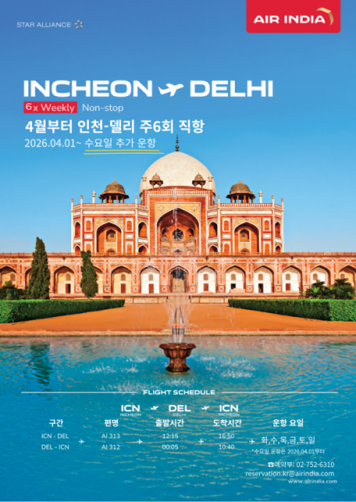 에어인디아, 인천~델리 주6회 증편 운항ⓒ에어인디아 에어인디아가 오는 3월 29일부터 인천~델리 직항 노선을 기존 주 5회에서 주 6회로 증편하며 한국 시장 공략에 속도를 낸다. 이번 결정으로 기존 화·목·금·토·일 운항에 수요일 비행편이 새롭게 추가되어 여행객들의 일정 선택 폭이 한층 넓어질 전망이다. 상세 운항 일정에 따르면 델리발 인천행(AI 312)은 ..