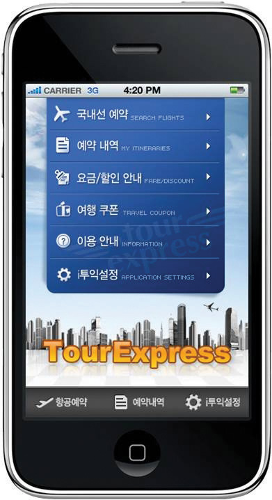 투어익스프레스가 국내최초로 스마트폰으로 국내선 항공의 실시간 조회와 예약부터 예약 결제까지 가능한 어플리케이션(이하 어플)을 지난 8월말 출시했다.