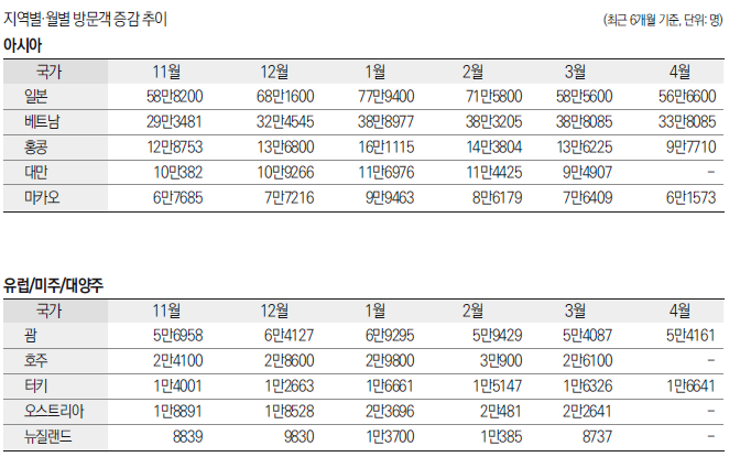 지난 4월 괌을 방문한 한국인관광객은 5만4161명으로 지난해 같은 기간 대비 10.1%가 하락한 수치를 보였다. 지난 4월은 괌을 방문한 한국인관광객 마켓셰어 비율은 3월(37%)에 비해 증가해 45%를 달성했다. 괌을 방문한 일본인관광객 점유율은 39%에 그쳤지만 괌으로 방문하는 관광객 회복세가 눈에 띈다. 올해 4월 4만7725명의 일본관광객이 괌을 방문했고 전년 동월 대비 19.5%가 성장했다. 이 외에도 괌을 방문한 나라 중 필리핀이 전년 대비 32.1%의 가장 가파른 성장세를 보이고 있다.