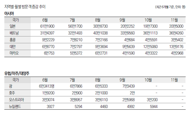 10월 일본을 찾은 한국인은 19만7300명에서 11월에는 다시 20만 명대로 진입하며, FIT와 겨울 방학 시즌을 통해 일본의 부진이 회복 될 것이라는 분석이다.